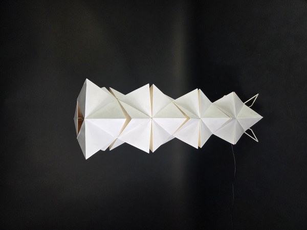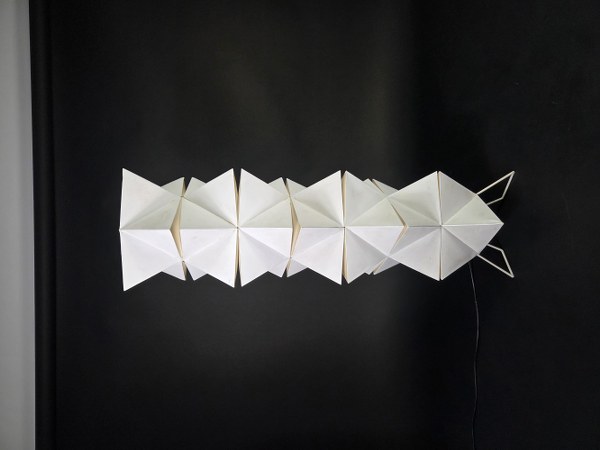 Lampadaire origami en carton plié, piétement en métal laqué. Travail moderne. Hauteur : 108 cm. Diamètre : 37 cm. Repeint, quelques traces d'usure.