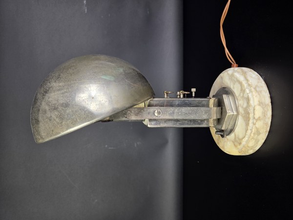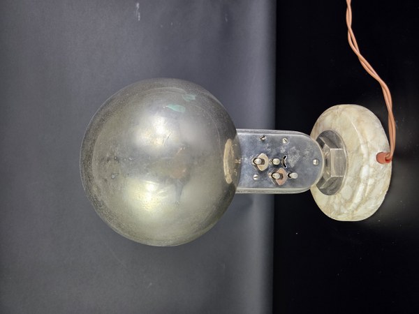 MOFEM. Lampe pendule moderniste. Structure et abat-jour demi sphérique en métal chromé. Pied en marbre. Vers 1940. Hauteur : 28 cm. Diamètre : 17 cm. Quelques très légères traces d'usure.