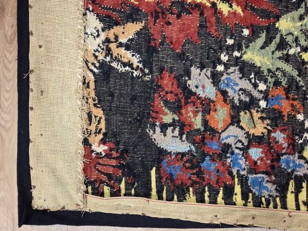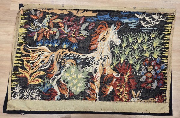 Tapisserie à décor de licorne et feuillage. Travail 1950. Quelques traces d'usage. 138 x 92 cm.