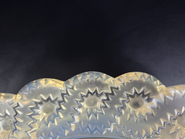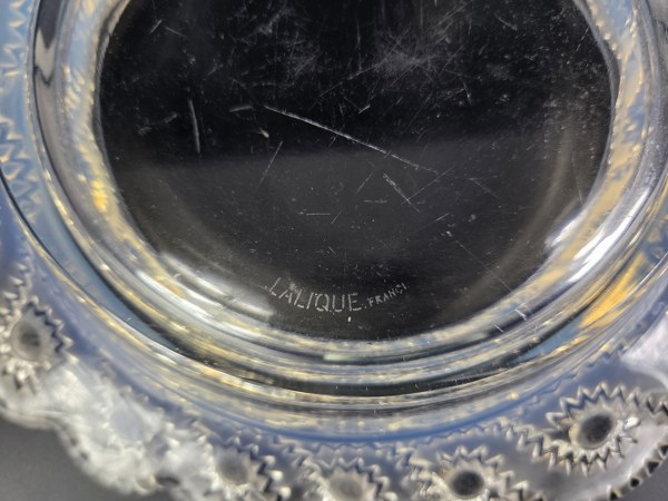 LALIQUE France. Jardinière modèle "Auriac" épreuve en verre blanc moulé-pressé patiné. Vers 1950. Signée. Hauteur : 6 cm. Longueur : 31 cm. Largeur : 26 cm.
