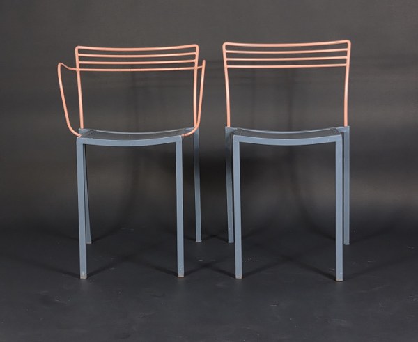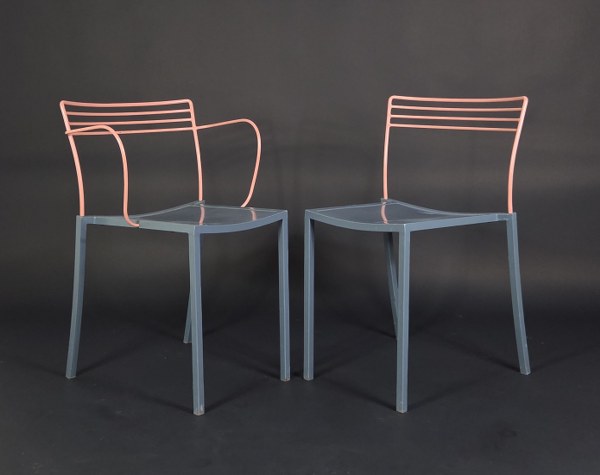 Pascal MOURGUE (1943-2014) et Fermob éditeur. Suite de cinq chaises et deux fauteuils modèle « Piccolo » à structure en métal laqué gris et dossier ajouré laqué saumon. Vers 1990. 74 x 44 x 50 cm et 74 x 50 x 50 cm. Quelques marques et traces d'usage, un fauteuil relaqué.