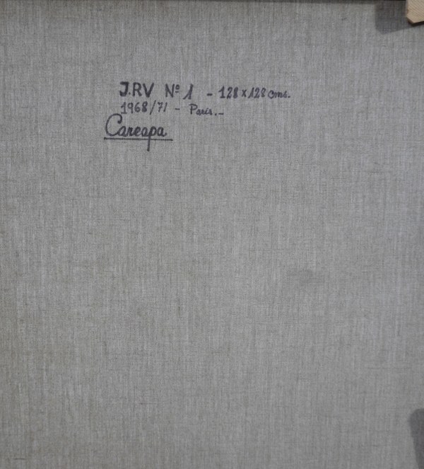 Enrique CAREAGA (1944-2014). J.RV n•1 Acrylique sur toile. Signé, titré et daté 1968/71 au dos. 128 x 128 cm. Après sa première exposition à " Asedio " en 1963, il rejoint le groupe " Los Novísimos " en 1964. À partir de cette date, il participe à des expositions d'art internationales. Il a cofondé le Musée d'Art Moderne d'Asunción en 1965 et a reçu une bourse du gouvernement français pour poursuivre des études sur l'intégration de l'art et de l'architecture dans l'atelier de Victor Vasarely entre 1966 et 1967. Il a vécu et travaillé en France, dans la ville de Paris de 1966 à 1978. Durant toute cette période, il a fait partie du mouvement optique et cinétique de l'École de Paris. Il a reçu plusieurs prix et distinctions, dont la « Mention Honorable » en Peinture au Concours d'Arts Plastiques organisé par le Centre Culturel Paraguayen Américain en 1964.