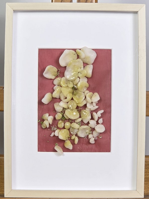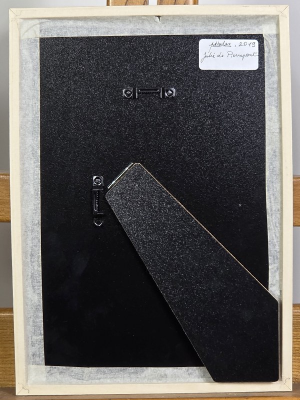 Julie DE PIERREPONT (Née en 1985). Pétales. Technique mixte en relief sur tissu, signée, titrée et datée 2019 au verso. Encadrée 32 x 23 cm.
