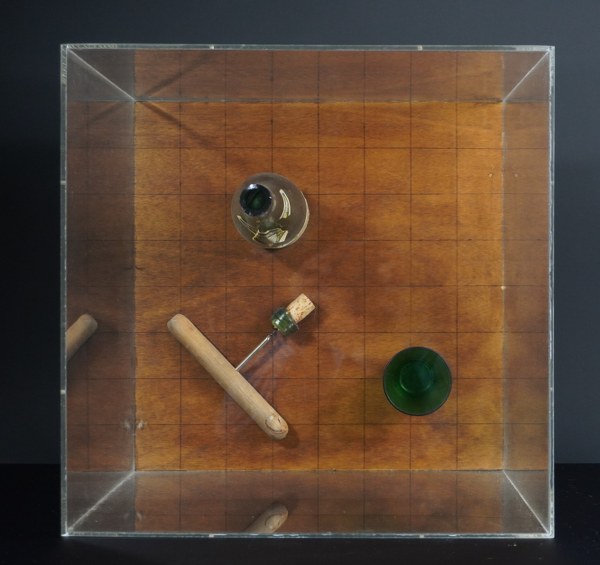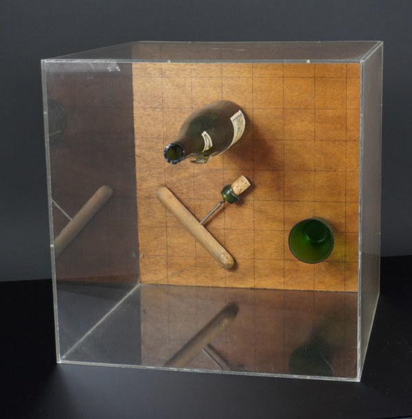 Daniel SPOERRI (1930-2024). Piège à hist, 1965. Tableau piège animé d'objets fixés sur une plaque de contreplaqué dont une bouteille, un verre et un tire bouchon. Signé et annoté sous la base : Daniel Spoerri - Piège à hist - keine regel ohne ausnahme. (L'exception qui confirme la règle) - okt 65 Paris. Hauteur : 40 cm. Longueur : 41 cm. Largeur : 41 cm.