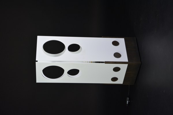 NICOLOFF (né en 1969). Lampe "lamp3" en acier laqué blanc et base en bois. Signée "Nicoloff création". Hauteur : 57 cm. Longueur : 20 cm. Largeur : 20 cm.
