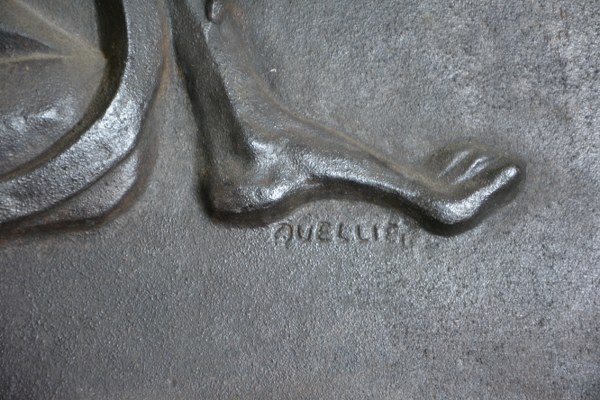 QUELLIER (XXème siècle). Plaque de cheminée en fonte représentant une femme aux épis de blé. Vers 1960. 60 x 50 cm.