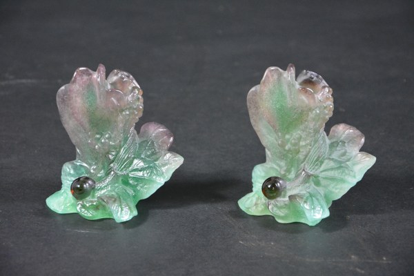 DAUM France. Paire de bougeoirs en pâte de verre à décor d'escargot. Signés. Hauteur : 12 cm. Longueur : 11 cm. Largeur 10 cm.