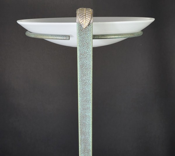 Pierre VANDEL (Né en 1939). Paire de lampadaires à base circulaire et fût cintré en métal laqué vert granité, vasque éclairante en verre. Plaque du créateur éditeur à la base du fût. Vers 1980. Hauteur : 186 cm. Diamètre : 37 cm. Traces d'oxydation à la base.