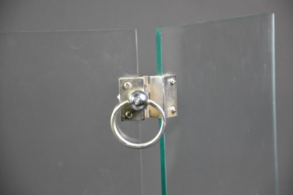 Attribué Jacques ADNET (1900-1984). Pare-feu en verre et métal chromé à décor d'anneaux en façade. Vers 1950. Ouvert : 60 x124 x 3,5 cm. Fermé : 60 x 68 x 7,5 cm. Quelques égrenures, manque deux baguettes.