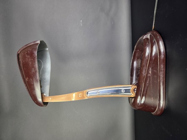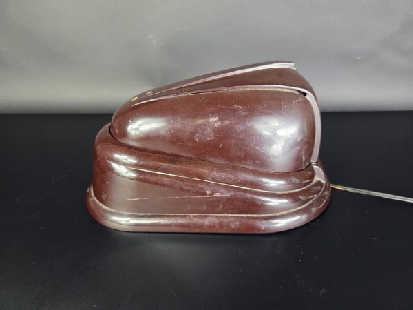 JUMO. Lampe "Bolide" à bras articulé métallique en cuivre et cache ampoule ovalisé. Épreuve d'époque en bakélite marron. Vers 1945. Hauteur : 32 cm. Longueur : 27 cm. Largeur : 19 cm. Légères traces d'usage.