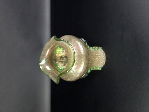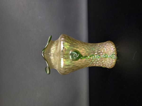 Attribué à Johann LOETZ (1848 - 1933). Vase à col mouvementé en verre irisé à décor appliqué à chaud de guirlandes verte. Vers 1900. Hauteur : 17 cm. Diamètre : 11 cm.