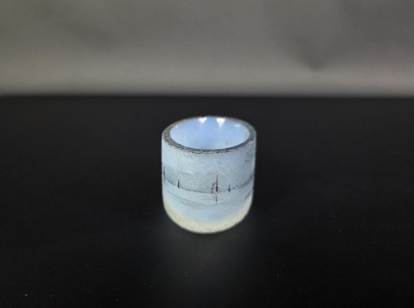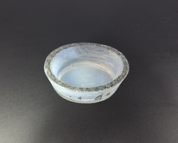 DAUM Nancy. Vase miniature en verre givré à décor en grisaille de paysage et de bateaux. Signé sous la base DAUM Nancy et croix de Lorraine à l'or. Vers 1900. Hauteur : 3 cm. Longueur : 5 cm. Un infime éclat sur le bord du vase.