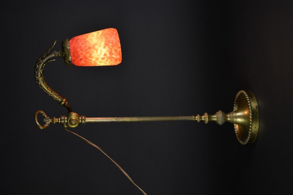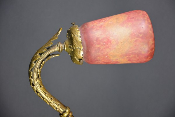 DAUM Nancy. Lampe de bureau en bronze patiné et tulipe en verre poudré orange et framboise. Vers 1900. Signature incisée "Daum Nancy". Hauteur : 54 cm. Longueur : 29 cm. Largeur : 14 cm.