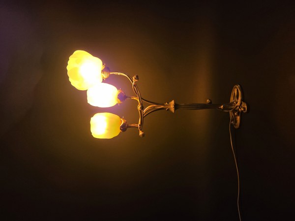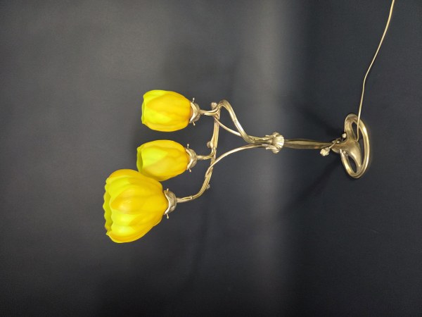 D'après un modèle de Louis MAJORELLE. Grande lampe flambeau à trois lumières d'après le modèle "Magnolia", en bronze. Trois tulipes en verre jaune et orange. Travail contemporain. 83 x 45 x 20 cm.
