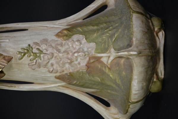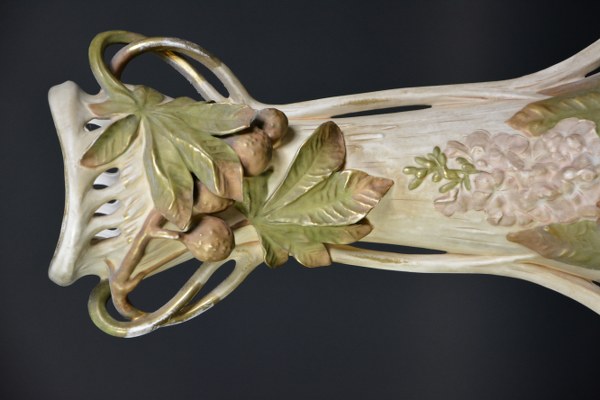 ROYAL DUX Bohème. Paire de grands vases balustres en porcelaine à fond crème patinée, décoré de larges feuilles vertes et or à deux anses. Cachet ROYAL DUX BOHEMIA sous la base et numérotés en creux. Vers 1900. Hauteur: 53 cm. Longueur: 30 cm. Largeur: 28 cm. Légers cheveux.