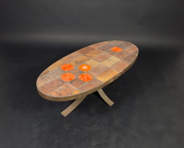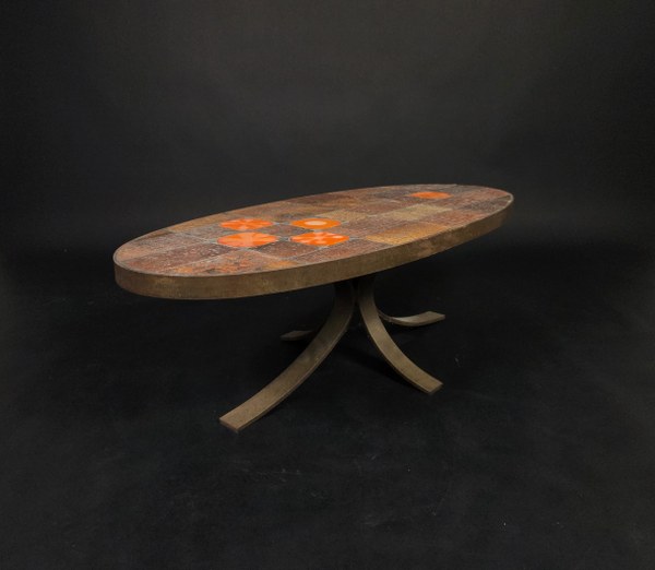 Jean JAFFEUX (1913-2005). Table basse de salon à dessus en pierre de lave émaillée et céramique polychrome à décor abstrait, piétement métallique . Vers 1970. 34 x 107 x 48 cm. Oxydation importante.
