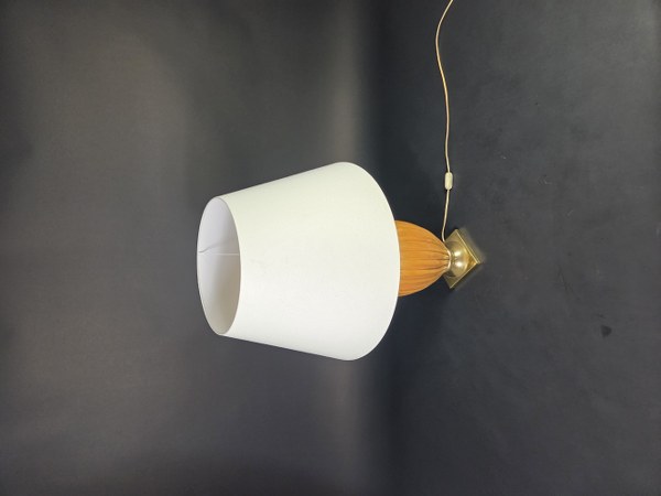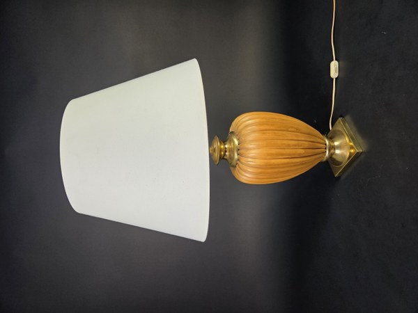Travail 1980. Lampe de forme balustre à larges godrons en bois et laiton. Hauteur : 85 cm. Diamètre : 55 cm. Traces d'usage, oxydation