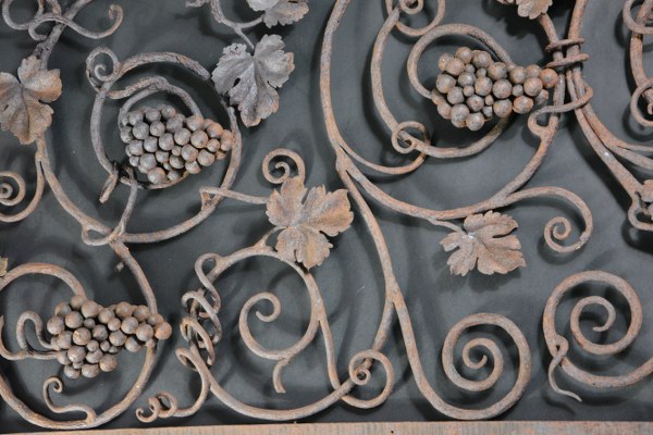 Dans le goût d'Edgar BRANDT. Paire de grilles en fer forgé, à décor de vigne, de raisin et de volutes. Vers 1930. 174 x 130 x 9 cm. Oxydation importante.