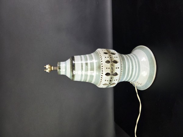 Pierre PISSAREFF (1904-1981). Pied de lampe en céramique émaillée gris à décor ajouré. Monogrammé. Vers 1970. Hauteur : 38 cm. Diamètre : 18 cm