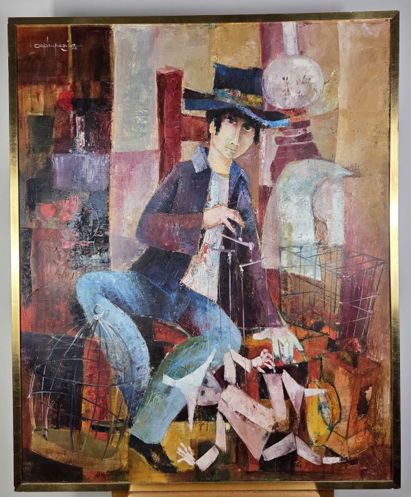 Jean Claude DESPLANQUES (1936-2025). Le marionnettiste. Huile sur toile signée et datée 68 en haut à gauche. 100 x 81 cm.