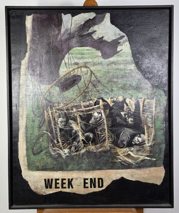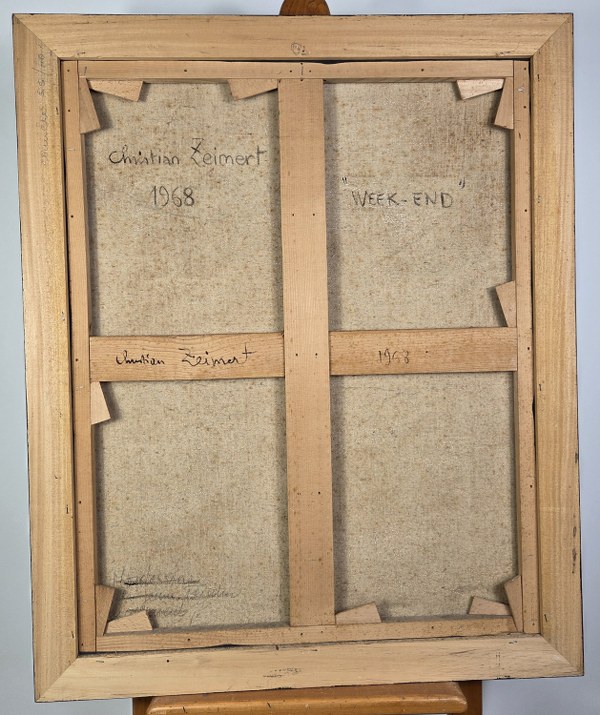 Christian ZEIMERT (1934-2020). Week-end. Huile sur toile, signée et datée 1968 en bas à droite et contresignée, datée et titrée au dos. 86 x 70 cm.