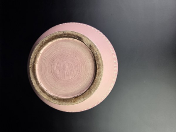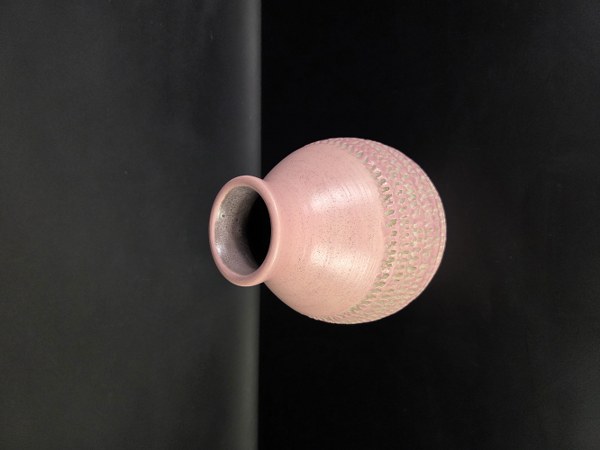 Dans le goût de Jean BESNARD (1889-1958). Vase en grès émaillé rose à décor horizontal incisés à la mollette. Vers 1930. Hauteur : 25 cm. Diamètre : 19 cm.