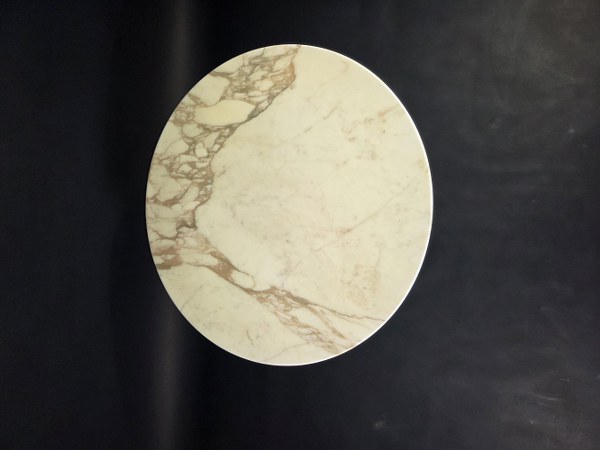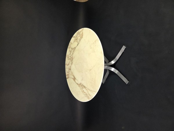 Table basse à piétement cruciforme en métal brossé et laqué, plateau circulaire en marbre vernis. 55 x 90 cm.