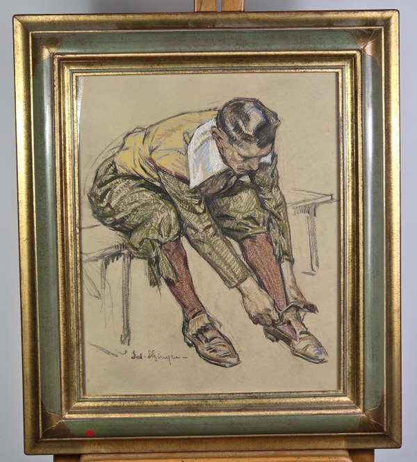 Édouard ELZINGRE (1880-1966). Homme se chaussant. Sans titre, fusain et pastel sur papier signé en bas. Encadré: 67 x 58 cm.