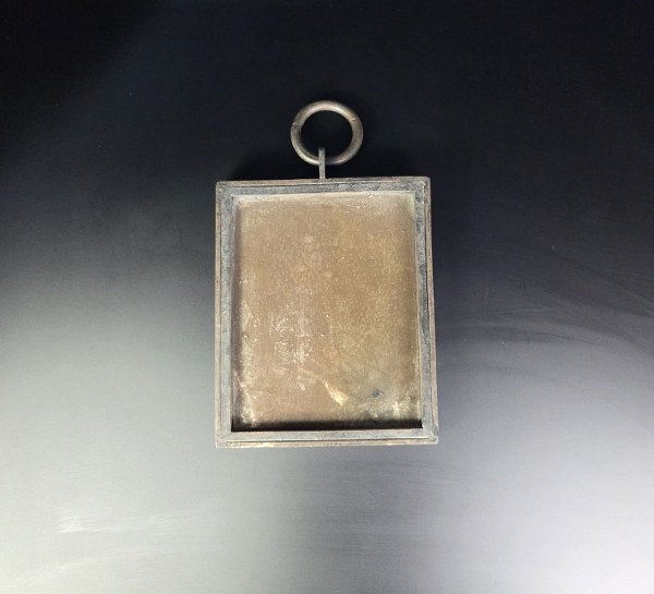Miroir rectangulaire en épais métal brut, surmonté d'un anneau. Travail brutaliste. Vers 1970. Hauteur : 39,5 cm. Largeur : 23,5 cm. Traces d'usage et d'usure, fond de miroir très usé.
