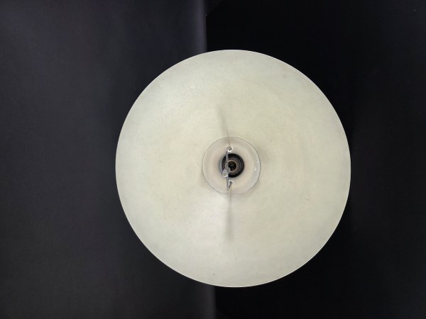 Ezio DIDONE (Né en 1939) et Arteluce éditeur. Plafonnier "Mira C" en aluminium et verre dépoli. Vers 1980. Hauteur : 57 cm. Diamètre : 60 cm. Traces d'usage et d'usure, rayures, manque le verre dépoli supérieur.