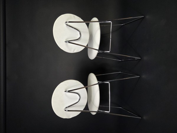 Paire de chaise à structure en métal chromé, assise et dossier en similicuir blanc. Travail 1980. 83 x 47 x 55 cm.