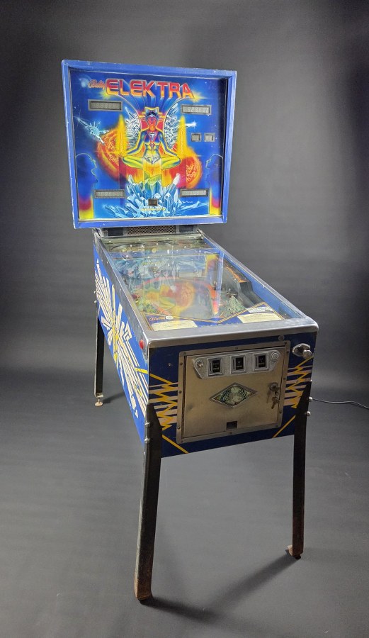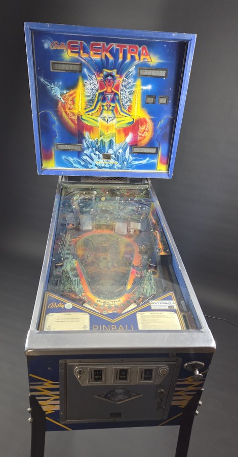 BALLY. Flipper à monnayeur modèle "Elektra" Date de sortie 1981. Deux livrets technique électronique fourni. 181 x 130 x 77 cm. Une révision sera à prévoir, traces d'usage et d'usure, oxydation sur les pieds. Sans garantie de fonctionnement.