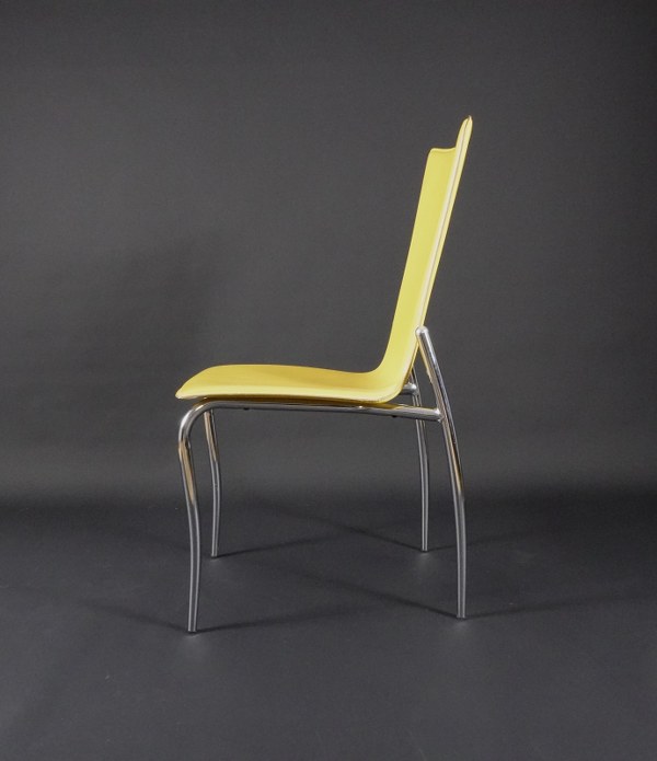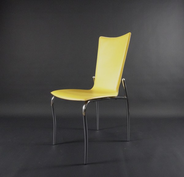 EFFEZETA. Suite de huit chaises à structure en métal tubulaire chromé, assise en cuir jaune. Vers 1980. 103,5 x 50 x 37 cm.