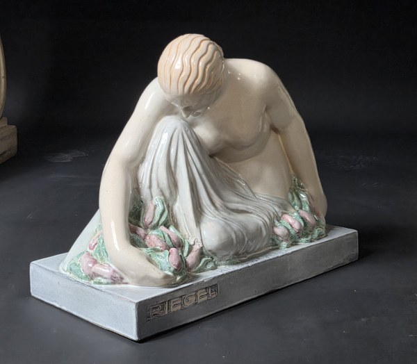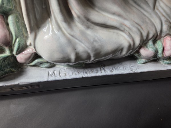 Maurice Guiraud-Rivière (1881-1947) & Atelier André Fau. Sculpture en céramique émaillée polychrome représentant une femme drapée se prélassant dans des fleurs. Inscription « Riegel » sur la base. Signature "Maurice Guiraud Rivière" et cachet de la manufacture de Boulogne-sur-Seine sous la base. Vers 1925. Hauteur: 33 cm. Longueur: 45 cm. Largeur: 20 cm.