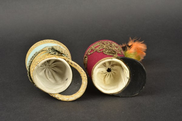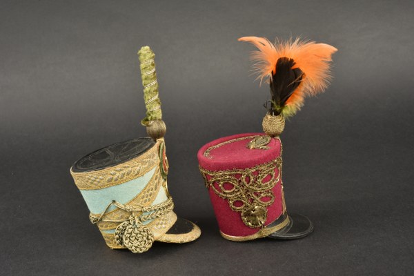 Lot de 2 Shakos miniatures. Dans le gout du 1er Empire et Restauration. Un couleur fuschia avec aigle impérial,l'uatre bleu de ciel avec insigne 9e Chasseur et bouton au coq. Avec plumets. Très joli en vitrine II+