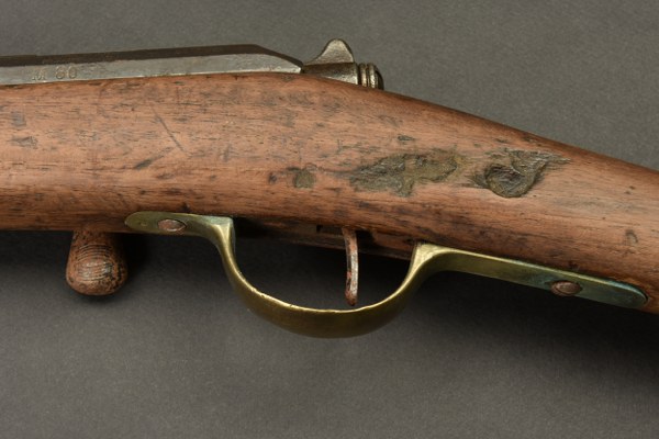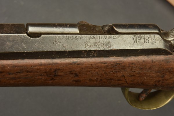 Fusil Gras 1874. Crosse dans sa longueur d'origine, bois vermoulu, garnitures en laiton complètes. Légères piqures sur le canon, boitier portant le marquage de la Manufacture d'armes de Tulle, modèle 1874 M80. Le canon porte la date de fabrcation T1885, culasse et canon et même numéro. Mecanisme fonctionnel mais non vérifié au tir. Etat II+