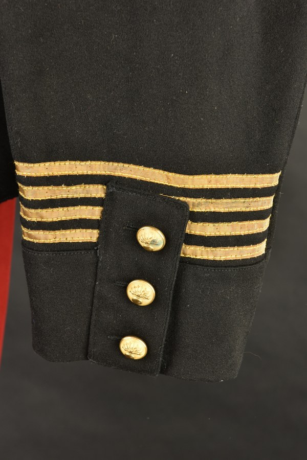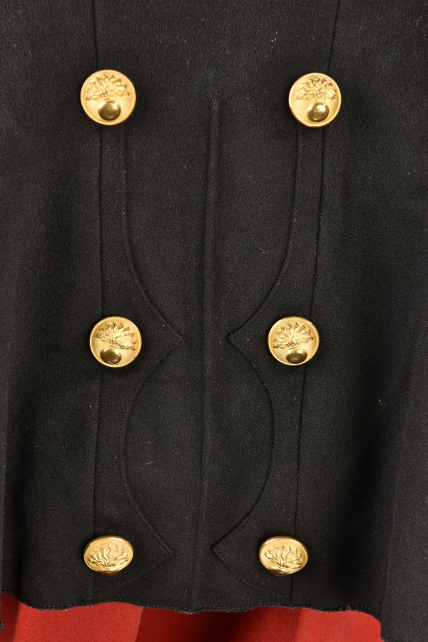 Uniforme d'un commandant d'infanterie. Veste d'officier en drap noir à quatre poches se fermant par neuf boutons aux armes de l'infanterie, grades de commandant cousus aux bas des manches, grenades brodées cannetille de l'état major. Doublure en satinette noire. Pantalon droit en drap garance à larges bandes noires, doublure en coton rayé. Etat II+