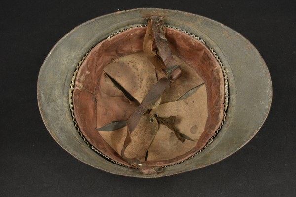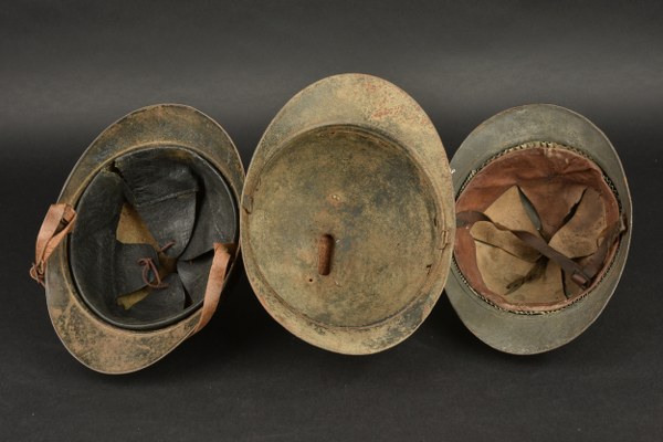 Lot de 3 casques Adrian modèle 1915. Un beau casque d'infanterie, peinture gris bleu au pinceau, possiblement postérieure, avec coiffe du 2nd type et jugulaire. Un second casque d'infanterie avec sa peinture bleu horizon d'origine, usure et oxydation, coiffe et jugulaire postérieures, et une coque de grande taille sans attribut ni coiffe ni jugulaire. Usure d'usage, rouille. II-