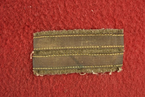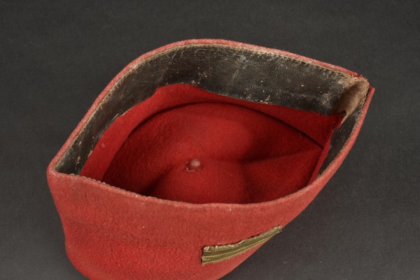 Chéchia d'un lieutenant de Tirailleurs. En drap écarlate avec bandeau de sudation en basane noire. Grade de lieutenant doré sur fond de drap moutarde. Quelques trous de mites, usure, patine II