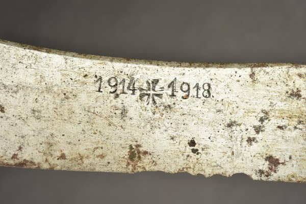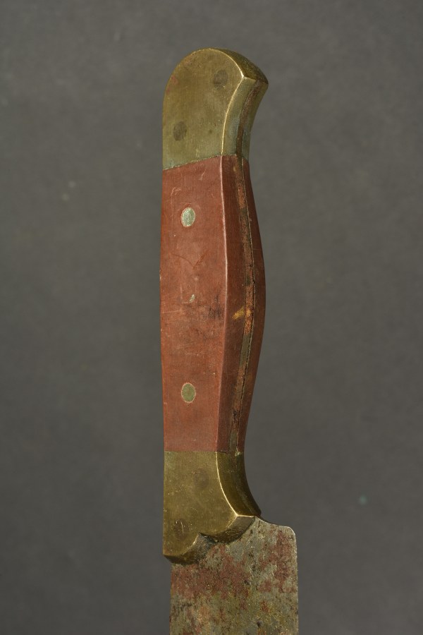 Lot de 3 poignards de tranchée type couteaux civils. 2 à plaquettes bois, un à plaquettes fibres. Garnitures laiton. Un grand à lame type Bowie gravée d'une croix type croix de fer et dates 1914 1918, émoussée, longueur totale 32 cm, sans fourreau. Un moyen de 31,2 cm, avec un foureau bois, un troisième de 26,5 cm, sans fourreau. Usure, patine, rouille, à nettoyer II