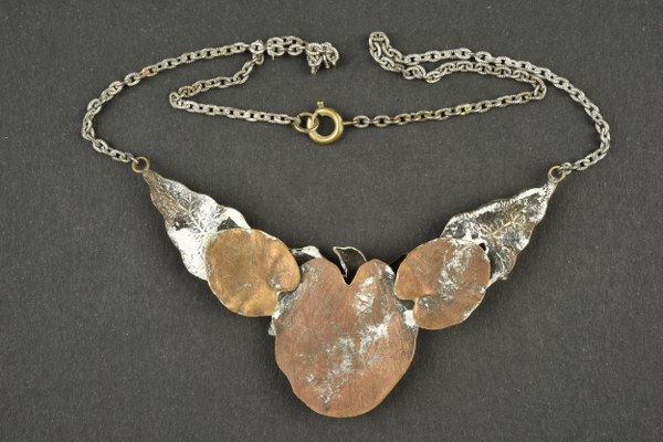 Collier parure en artisanat de tranchée. En cuivre et laiton représentant un oiseau sur des feuilles. Chaînette en métal blanc. À nettoyer II