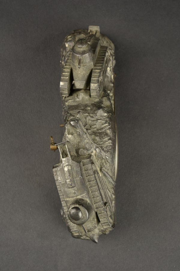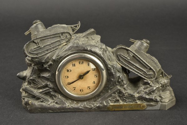 Horloge du 502 Régiment de Chars de Combat avec FT17. Horloge à poser en régule. Figurant 2 chars FT17 franchissant tranchée et obstacle. Caadran rond. Petite plaque laiton au bas de la terrasse marquée Souvenir du 505 R.C.C.. Signature au dos de la terrasse E. R??? Paris. Fabrication années 20. Une clé de remontage présente. Dimensions 20,4 cm long x 5 cm large x 11,8 cm de haut. Mécanisme non testé. II