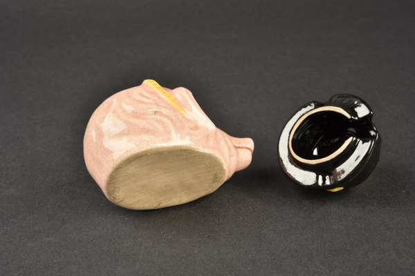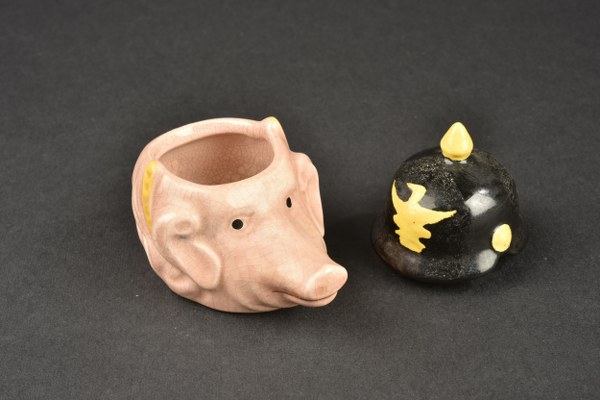 Pot à moutarde tête de cochon à casque à pointe. Objet satyrique en faience figurant une tête de cochon coiffé d’un casque à pointe. En bon état, pas de coup visible. I-