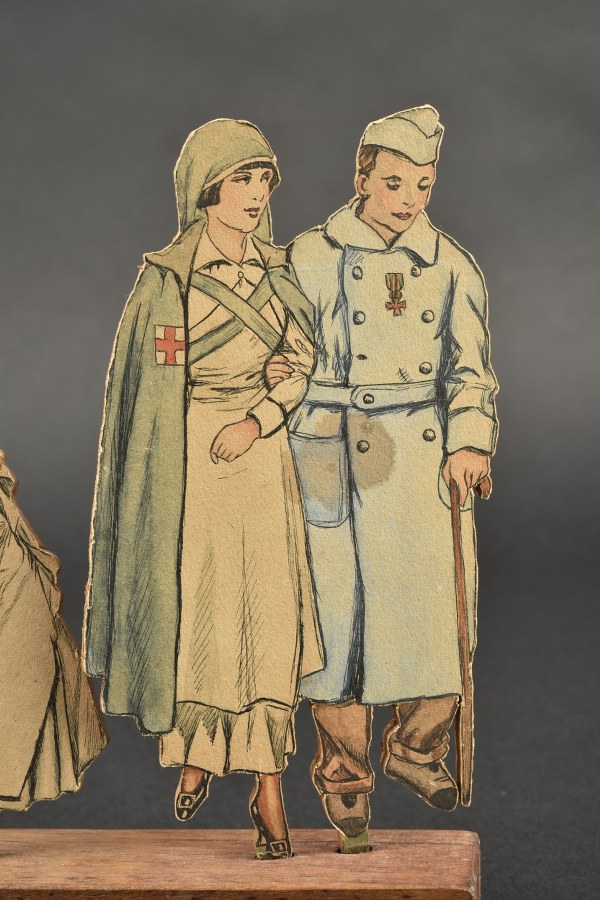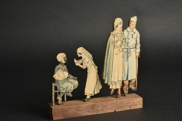 Scénette en bois avec infirmières et poilus. Jolie scénette composée de découpages papiers collés sur silhouettes en bois, figurant une infirmère aidant un poilu blessé à marcher et une seconde infirmière, dont il manque une main, soignant ou nourrissant un tiraileur blessé. Sur un socle rectangulaire en bois. Une des silhouette porte au dos la mention manuscrite "fait par moi Lucile 1914". Bon état II+