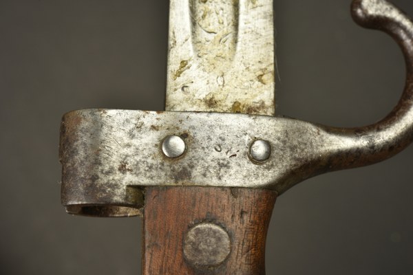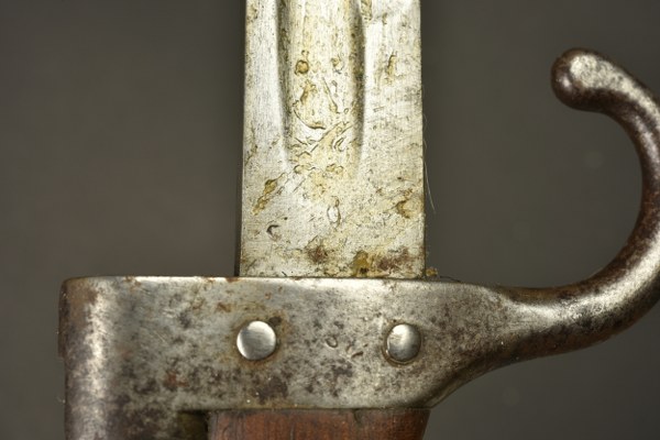 Baïonnette Modèle 1892 Berthier avec porte fourreau Japy. Epée baïonnette modèle 1892 pour mousqueton Berthier. Plaquettes bois. Poussoir fonctionnel. Belle lame à dos plate, non marqué, numéro de série sur le quillon, différent de celui du fourreau. Légère oxydation de surface à nettoyer. Avec un porte fourreau en cuir marron marqué au dos du fabricant JAPY PARIS II