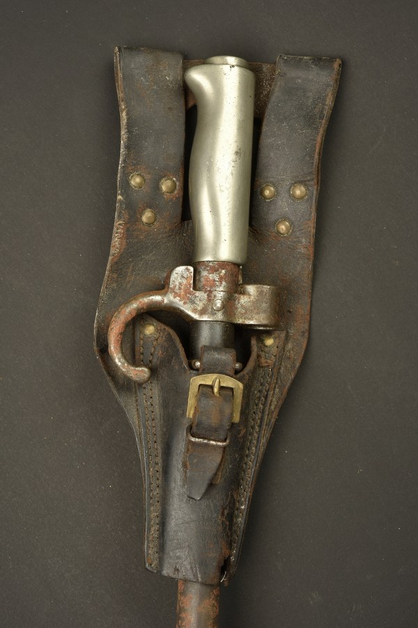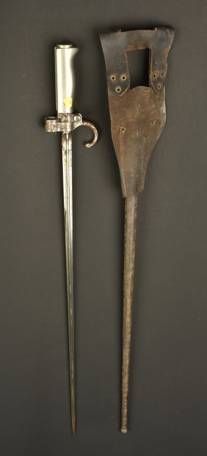 Baïonnette Rosalie modèle 1886 à quillon avec porte fourreau riveté. Poignée maillechort à quillon, poussoir fonctionnel. Lame cruciforme dans sa longueur. Fourreau fer. Porte fourreau en cuir riveté laiton, abimé sur un côté à la sortie du fourreau. Usure, patine, oxydation II
