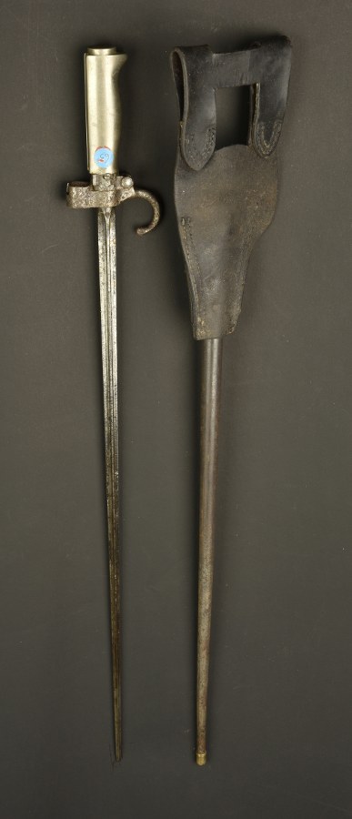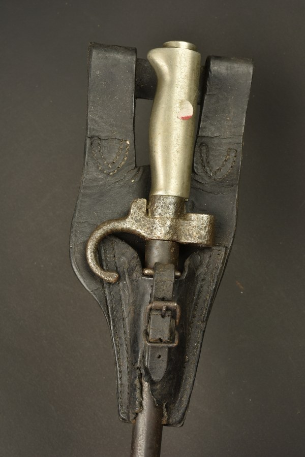 Baïonnette Rosalie modèle 1886 à quillon avec porte fourreau. Poignée maillechort à quillon, poussoir bloqué, forte oxydation. Lame cruciforme dans sa longueur. Fourreau fer avec une bouterole laiton rapportée artisanalement. Porte fourreau en cuir, graissé, sec, cassant, avec manques. III+