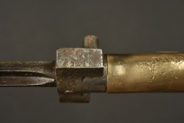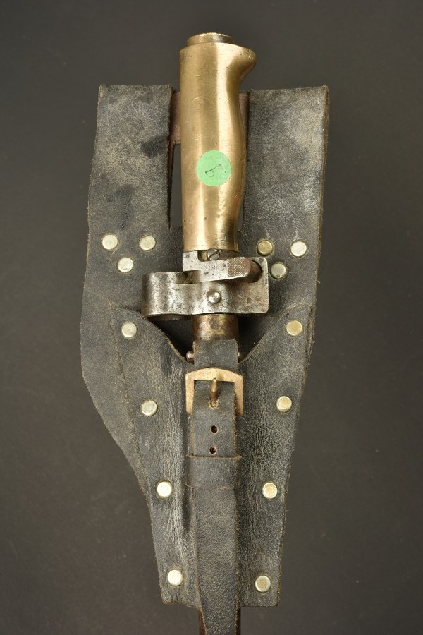 Baïonnette Rosalie modèle 1886 sans quillon avec porte fourreau riveté. Poignée laiton sans quillon, poussoir fonctionnel. Lame cruciforme dans sa longueur. Fourreau fer. Coups sur la poignée, usure, patine, oxydation superficielle à nettoyer. Porte fourreau en cuir riveté, authenticité non garantie II