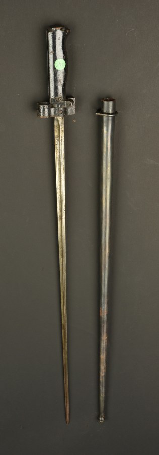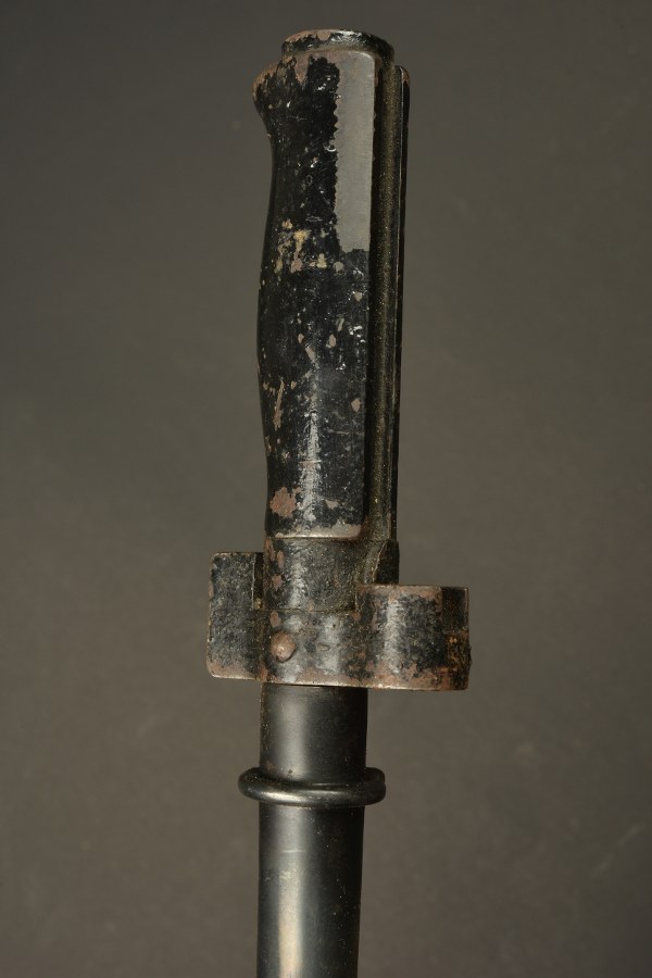 Baïonnette Rosalie modèle 1886 poignée fer. Poignée en fer peinte postérieurement en noir. Lame cruciforme. Fourreau fer. Oxydation, usure et patine II-