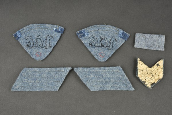 Ensemble de pattes de col du 106ème RI. Comprenant un chiffre de képi bleu horizon, une paire de pattes de col troupe pour capote sur drap bleu horizon portant chacune une pastille rouge de compagnie, deux grades de manche, un insigne de présence au front comprenant 4 chevrons. Etat II+